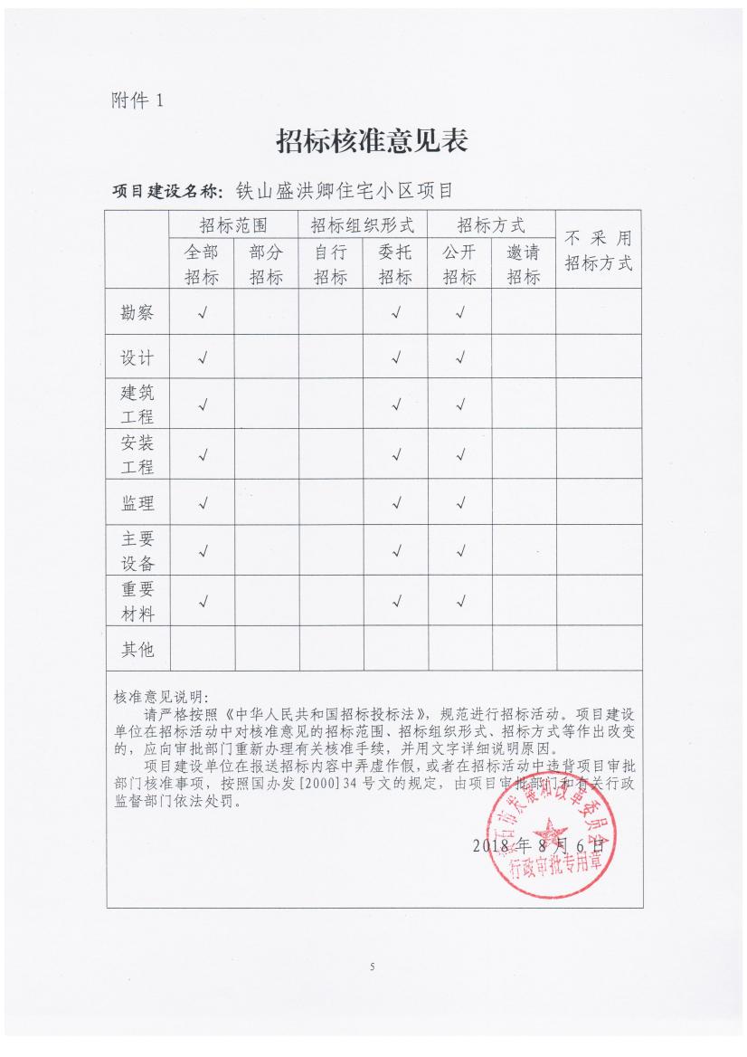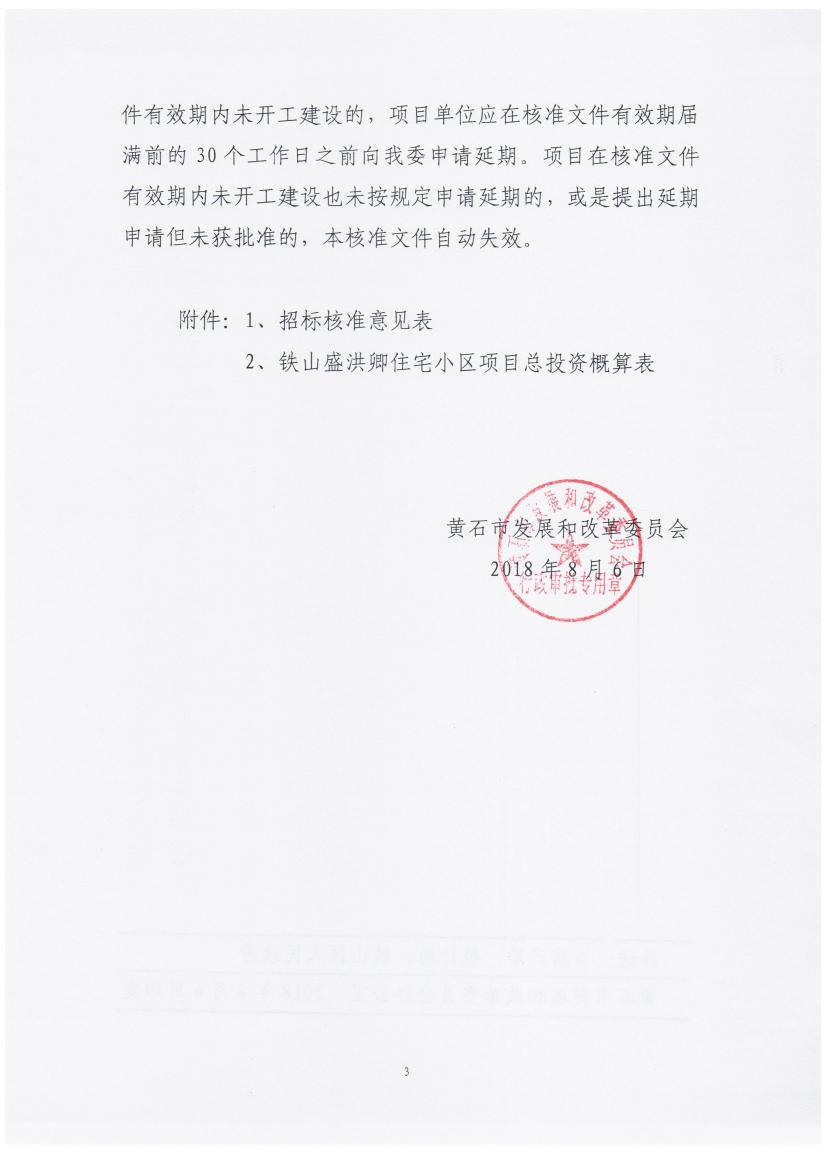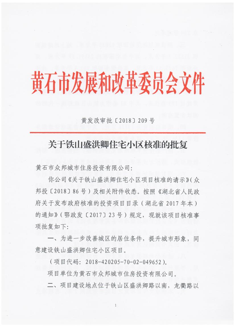 关于铁山盛洪卿住宅小区核准的批复
