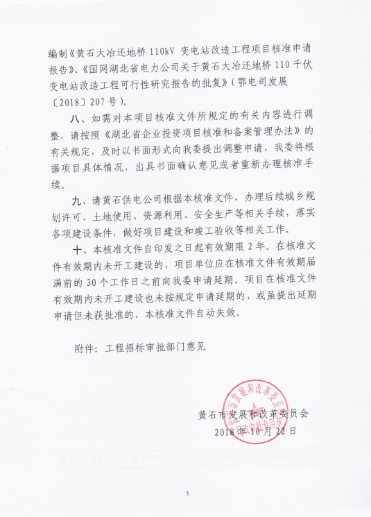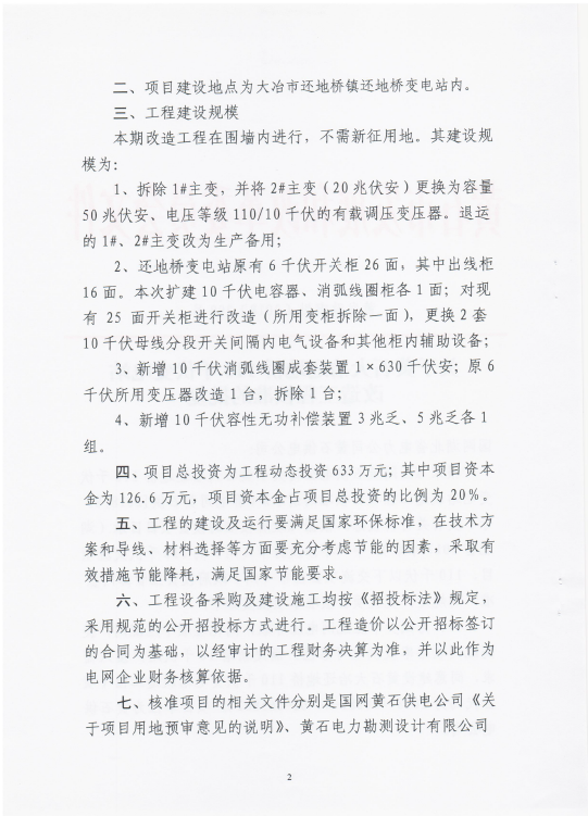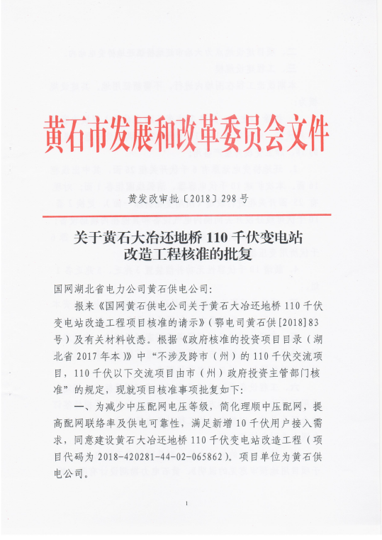 关于黄石大冶还地桥110千伏变电站改造工程核准的批复