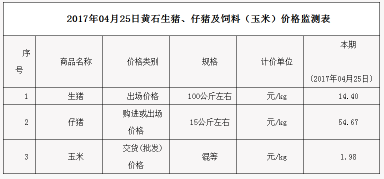 黄石生猪、仔猪及饲料(玉米)价格监测表(20170425)